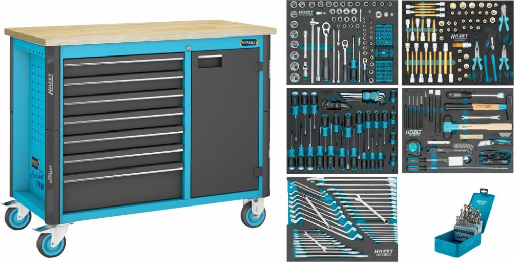 Zvolte HAZET pracovní stůl Asistent 179NW pro maximální organizaci nářadí, robustní konstrukci, komfortní mobilitu díky brzděným kolečkům, bezpečné centrální zamykání a vysokou nosnost až 750 kg, ideální pro profesionální dílny.