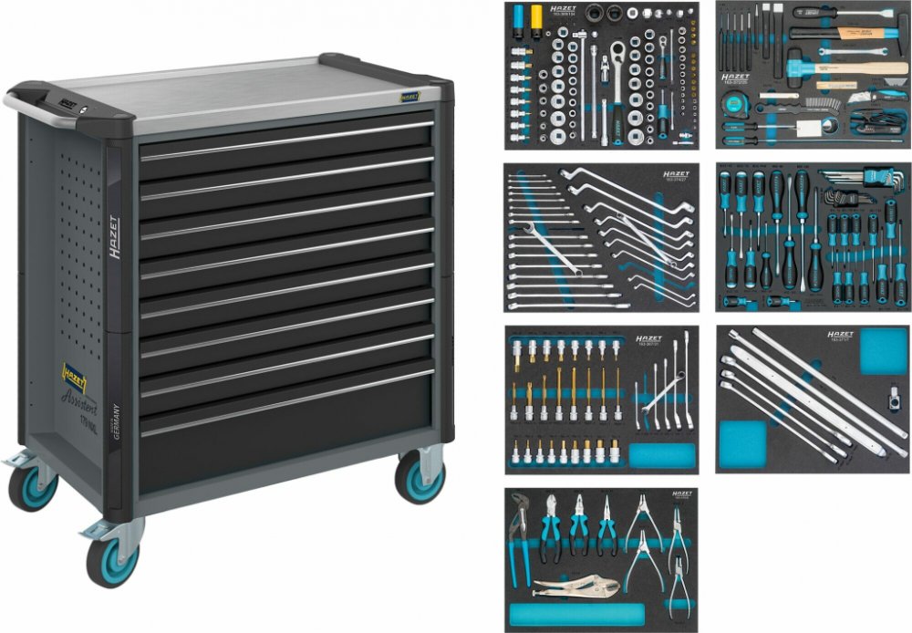 Tento dílenský vozík HAZET nabízí vysokou mobilitu, robustní konstrukci, bezpečné zajištění a velkou pracovní plochu z nerezu s kompletní sadou nářadí, což z něj činí nepostradatelného pomocníka pro profesionály i dílnu.
