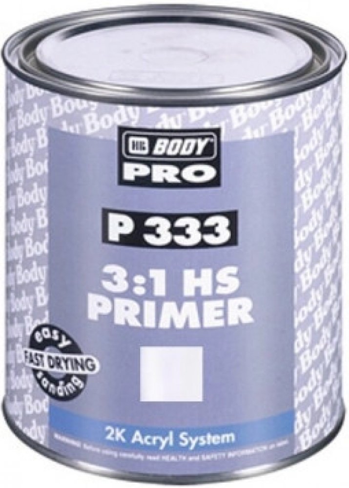 HB BODY PRO P333 je vysoce kvalitní akrylátová vyrovnávací nátěrová látka – určená pro částečné a úplné opravy karoserie. Vhodná pro originální nebo staré nátěry a ideální pro nebroušené O. E.M. (E-COAT) díly. Výrobek můžeme použít dvěma způsoby, a to standardně (po zaschnutí smirkovým papírem) nebo přímo „mokré do mokrého“. Díky jeho vysoké plnící schopnosti a tixotropnosti lze nanést větší tloušťku materiálu. Rychlé schnutí a výborné vyrovnávací schopnosti tohoto materiálu zaručují jeho ekonomické nanášení a rychlé broušení. Tuží se izokyanidovým tužidlem BODY HARDENER 725 FOR PRIMERS (# 725). Jednou z jeho největších výhod je, že je připraven k broušení již po 2h sušení na vzduchu