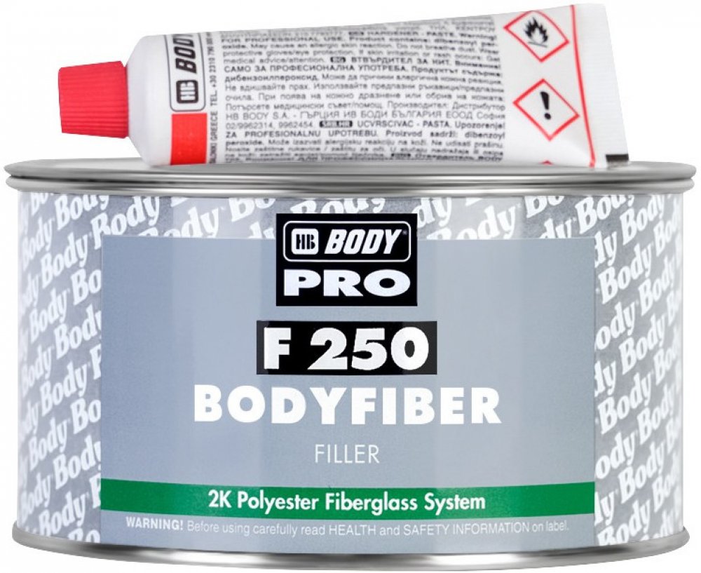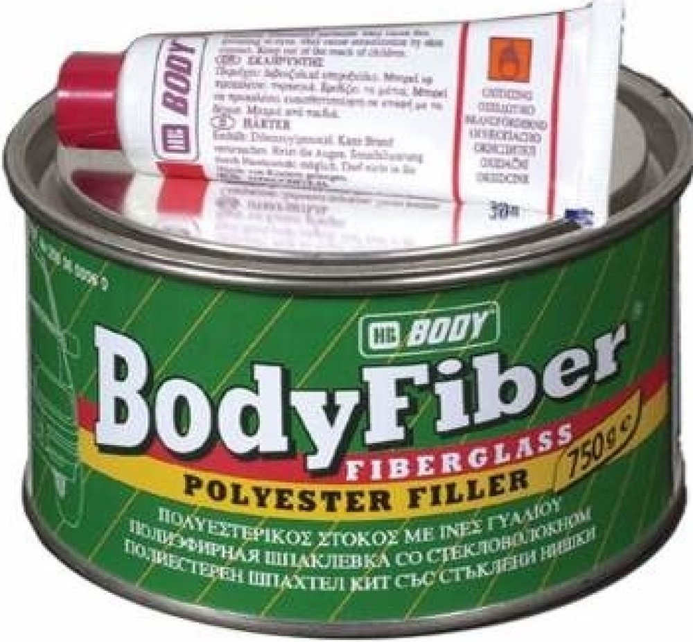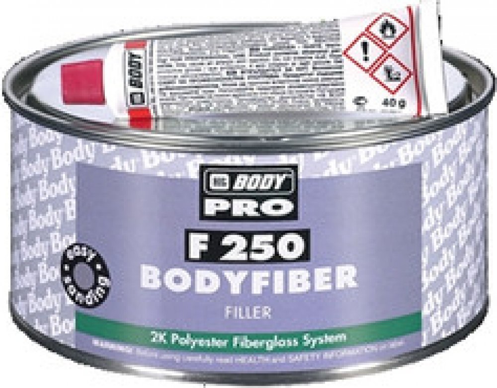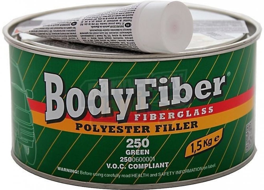 BodyFiber 250 skelné vlákno 750g Dvousložkový polyesterový stěrkový tmel se skelným vláknem hodný k tmelení velkých nerovností. Je rovněž vhodný k vyplnění menších prorezivělých děr v karosérii. Používá se také na opravy laminátu. Lehce se nanáší, rychle schne a snadno se brousí brusným papírem P80-120. Vytváří velmi odolný a elastický povrch. Tuží se v poměru 100:3 (2-3% tužidla).