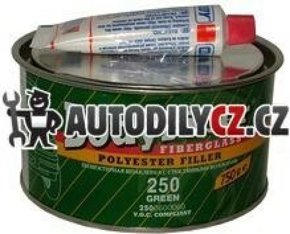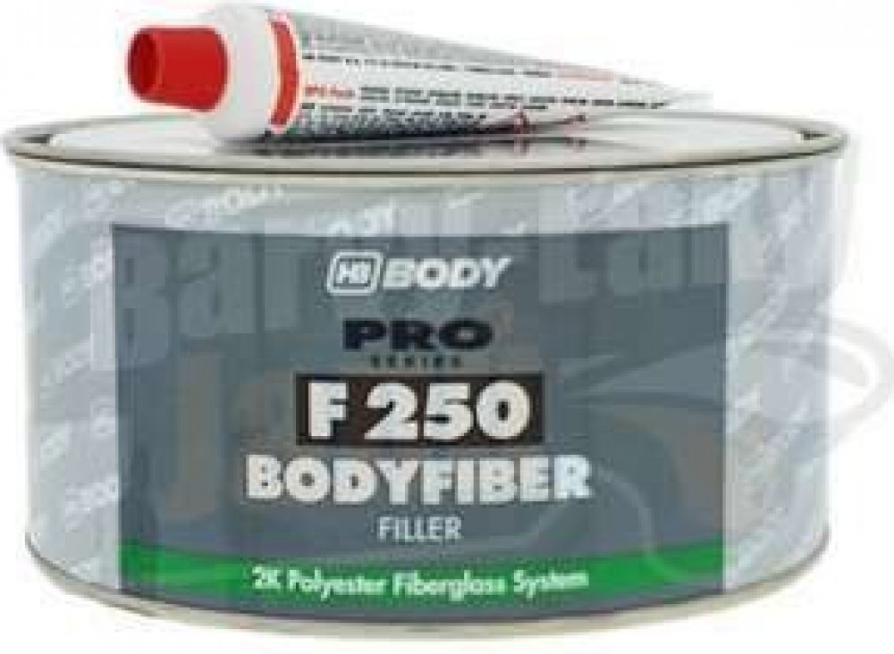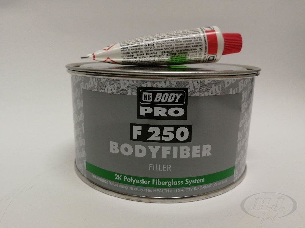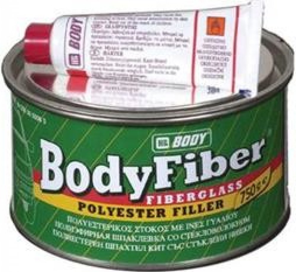 BodyFiber 250 skelné vlákno 750g Dvousložkový polyesterový stěrkový tmel se skelným vláknem hodný k tmelení velkých nerovností. Je rovněž vhodný k vyplnění menších prorezivělých děr v karosérii. Používá se také na opravy laminátu. Lehce se nanáší, rychle schne a snadno se brousí brusným papírem P80-120. Vytváří velmi odolný a elastický povrch. Tuží se v poměru 100:3 (2-3% tužidla).