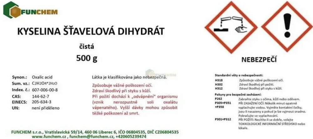 HB-Lak technická kyselina šťavelová vhodná pro údržbu pomníků, roztok se používá k čištění skvrn od rzi, inkoustu na bílých látkách a bělí dřevo. Použití:Rozpuštěním 100g v 1 l teplé vody získáte roztok, kterým bělíme dřevo, parkety a skvrnky od ovoce, inkoustu, vína a dehtových barviv. Dále se používá k čištění a leštění kovů a hlavně mramoru a kameniva starých náhrobků, kde též zamezuje růstu me...