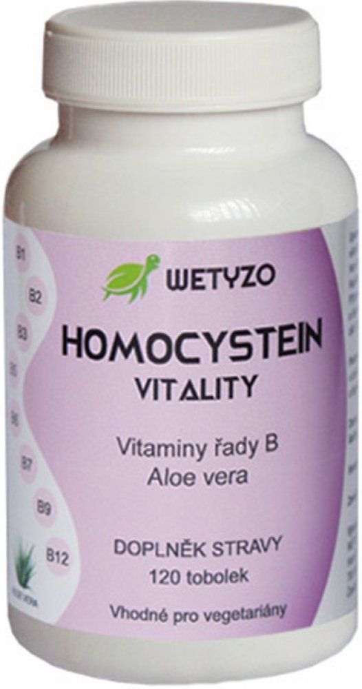 Homocystein Vitality s aloe vera je účinný doplněk stravy, který pomáhá předcházet civilizačním onemocněním. Obsahuje vitamíny B6, B9 (kyselina listová), B12 a aloe vera, která regeneruje vnitřní prostředí těla. Tento doplněk stravy je vhodný pro vegetariány i vegany.Vyvážená kombinace tří ve vodě rozpustných vitamínů řady B pro snížení hladiny homocysteinu, umocněná účinkem aloe vera. Homocystein Vitality je účinný doplněk stravy pro snížení hladiny homocysteinu. Obsahuje vitamíny B6 (pyridoxin), B9 (kyselina listová metafolin) a B12 (methylkobalamin), které přispívají k normálnímu metabolismu. Metafolin a methylkobalamin, bioaktivní formy B9 a B12, jsou lidským organizmem lépe vstřebatelné. Aloe vera regeneruje vnitřní prostředí těla. Vitamíny skupiny B jsou nepostradatelné pro správný metabolismus a nervový systém. Užívejte denně Homocystein Vitality, budete se cítit plní energie.