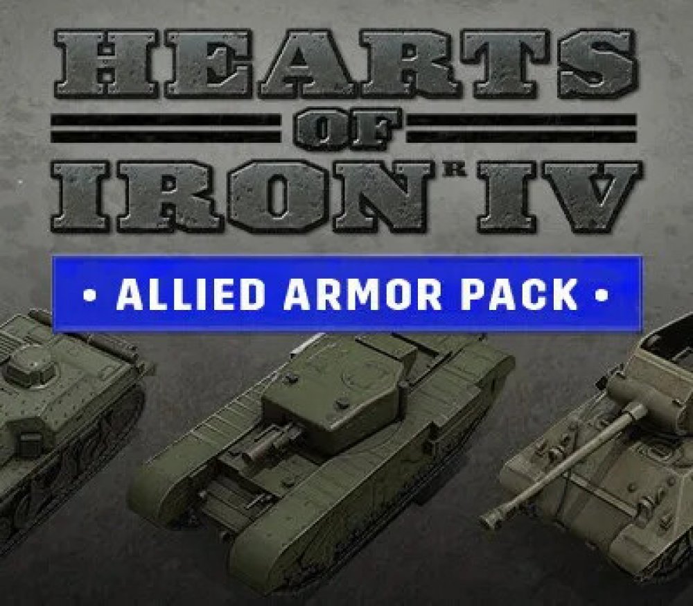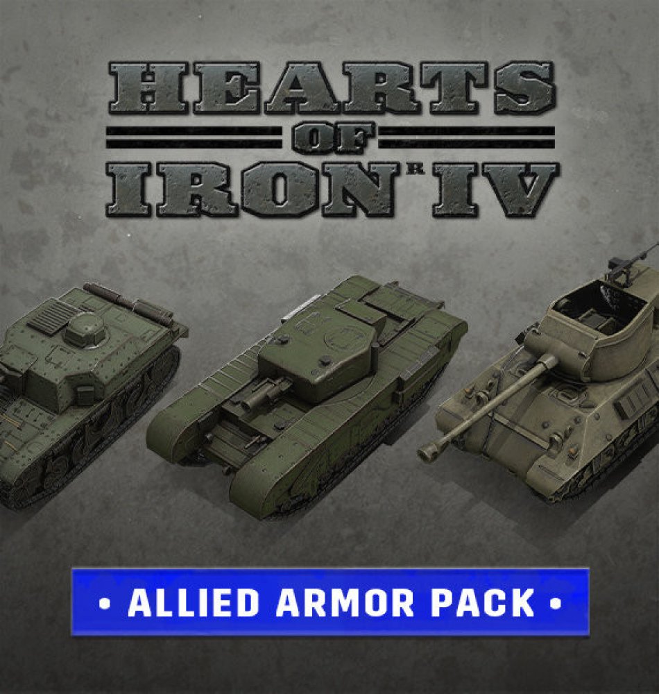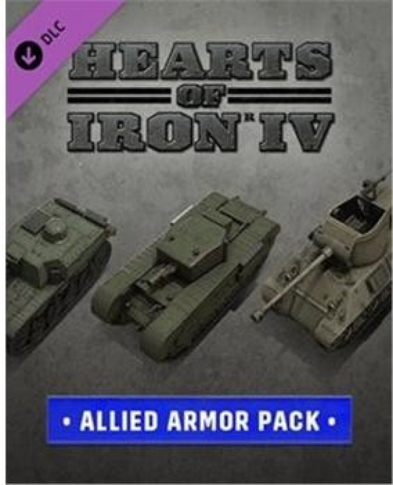 Elektronická licence určená pro platformu Steam Allied Armor Pack Probijte se Ardenami nebo stylově obkličte Osu s tímto novým kosmetickým balíčkem pro hru Hearts of Iron IV . Tento balíček obsahuje tanky, které byly dříve k dispozici pouze v edici Colonel, a přidává řadu nových obrněných a pásových vozidel pro spojence a mocnosti Kominterny. Balíček Allied Armor Pack obsahuje: 7 britských obrněných jednotek včetně stíhače tanků Deacon, kanadského samohybného dělostřelectva Sexton a protiletadlových jednotek Crusader. 17 amerických obrněných jednotek včetně slavného tanku M7 Priest a prototypu těžkého stíhače tanků M9. 8 francouzských obrněných jednotek včetně stíhače tanků Renault a samohybného dělostřelectva Canon de 194. 13 sovětských obrněných jednotek včetně raného stíhače tanků AT-1 a pěti variant dělostřelectva SU. 8 tanků pro každou hlavní spojeneckou mocnost, celkem 32 modelů tanků, včetně sovětského T-26, britského Centurionu, amerického poválečného těžkého tanku Patton a francouzského ARL 44. Pro aktivaci je nutné vlastnit základní hru Hearts of Iron IV v platformě Steam!