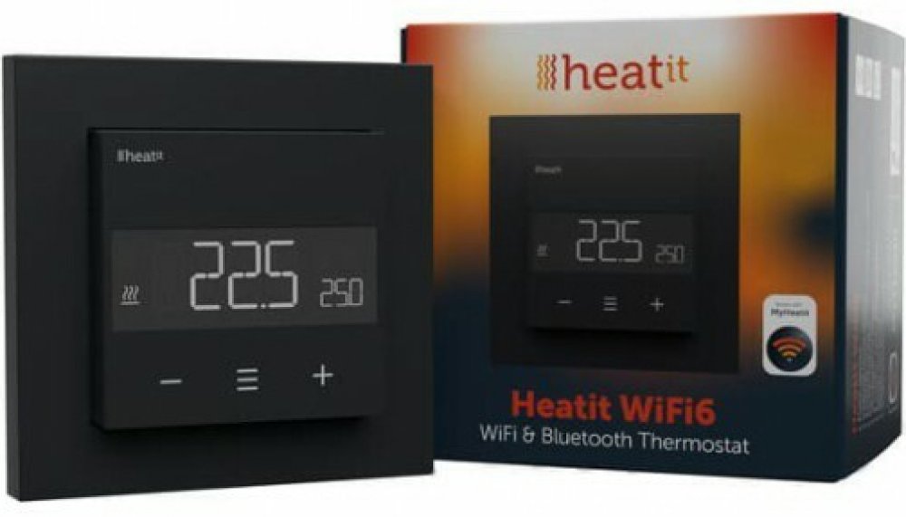 Heatit WiFi6 je elektronický termostat určený pro elektrické vytápění. Termostat lze ovládat pomocí aplikace „MyHeatit“ přes Wi-Fi, Bluetooth (BLE) nebo tlačítky na přední straně termostatu.
