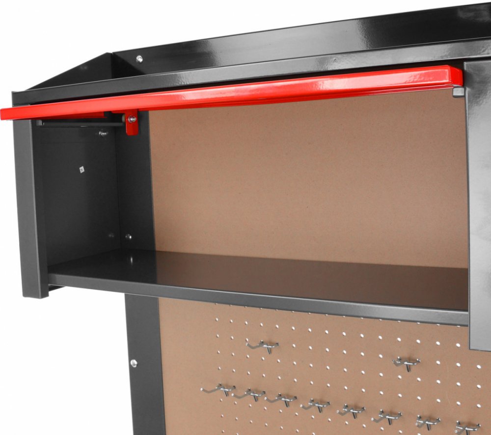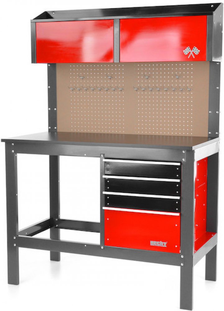 Dílenský pracovní stůl - ponk se závěsným panelem HECHT 2091Dílenský stůl HECHT o nosnosti 450 kg. Stabilní kovová konstrukce. Ideální do každé dílny. Udělejte si pořádek - stůl obsahuje 3 mělké a jednu hlubokou zásuvku pro uložení nářadí. Dvě vrchní skříňky a zadní deska s polohovatelnými háčky pro zavěšení nářadí. Závěsné háčky ZDARMA.4 zásuvky vybavené pojezdy s kuličkovými ložisky 2 horní zásu...