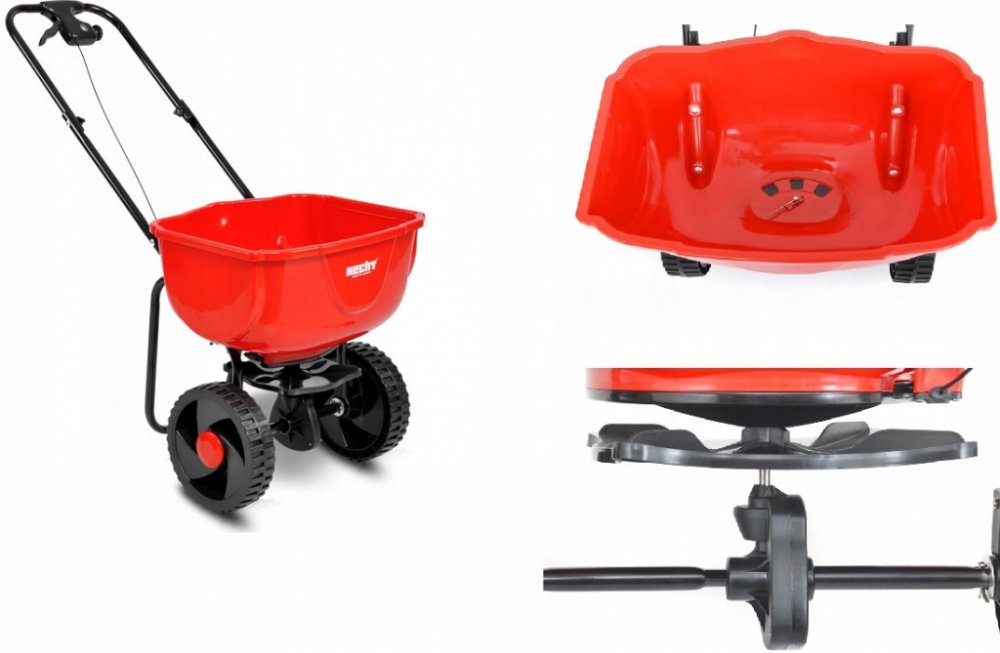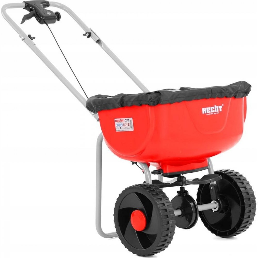 Ruční posypový rozmetač s regulací posypu určený k aplikaci hnojiv, osiva a v zimě i soli. Regulace posypu. Obsah 27 l. HECHT 270 je rozmetač s vynikajícím poměrem ceny a výkonu. Svým použitím účinností se do jisté míry vyrovná několikanásobně dražším podobným zařízením. Jeho hmotnost je pouhých 4,4 kg a do zásobníku lze nasypat až 27 l osiva, hnojiva nebo soli. Pohon systému je prováděn převodem z pojezdových kol. Díky tomu je zajištěn relativně rovnoměrný posyp povrchu - objem sypaného materiálu je přímo úměrný ujeté trase. Dávkování je snadno a přehledně nastavitelné přímo na madle. Dalším ovládacím prvkem je páka aktivující posypový mechanismus. S rozmetačem tak můžete libovolně pojíždět a mechanismus aktivujete pákou jen v místech, kde chcete provádět aplikaci posypu.