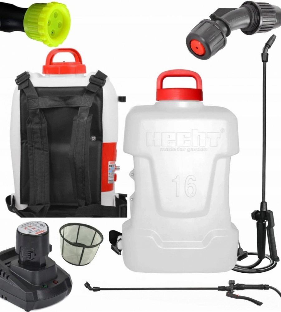 HECHT 416 ACCU je akumulátorový postřikovač, napájený z 12 V /7 Ah akumulátoru. Na jediné nabití vydrží až na 4 hodiny nepřetržité práce. Akumulátorem poháněný kompresor tlakuje přímo kapalinu až na 2,75 bar. Není tedy tlakována nádrž, jako je tomu například u některých ručních postřikovačů, a proto není problém kapalinu kdykoli do nádoby dolívat, aniž by bylo nutné odpouštět lak v nádobě.