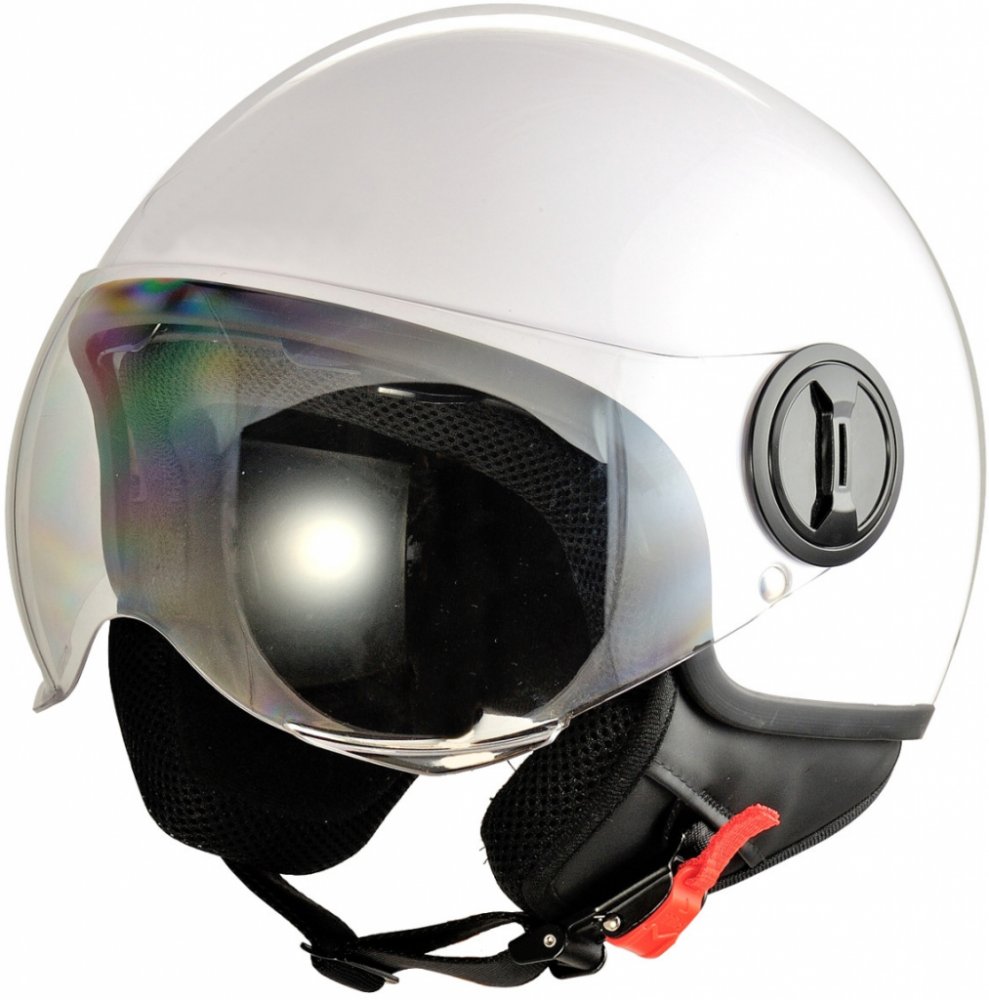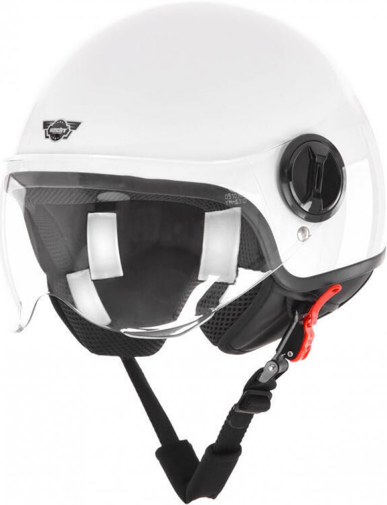 Ochranná přilba vhodná pro skútry a motocylky. Evropská homologace ER13*22R00*22RO5*10255*00. Materiál ABS. Velikost L (obvod hlavy 58 cm). Uvnitř je odnímatelná / omyvatelná a pohodlná vložka, upínací řemínek s rychlospojkou. Helma má kvalitní hladkou povrchovou úpravu a nastavitelný štít.