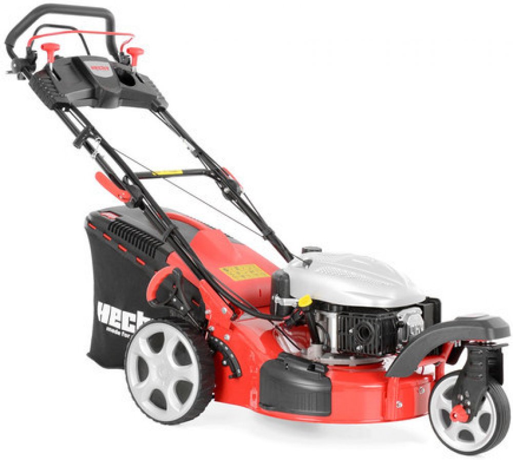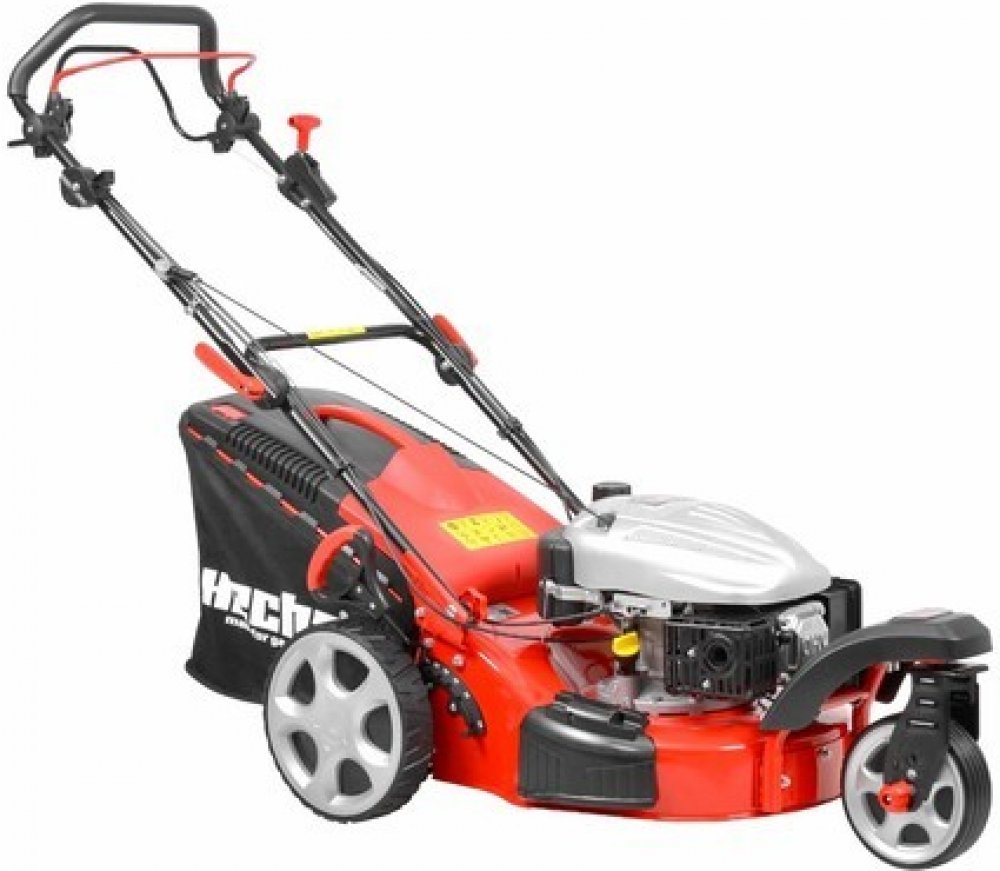 Motorová tříkolová sekačka s pojezdem, snadné sečení okolo překážek. Elektrický start. Výkon 5 HP, motor 135 cm3. Záběr 460 mm. Hmotnost 41,1 kg.