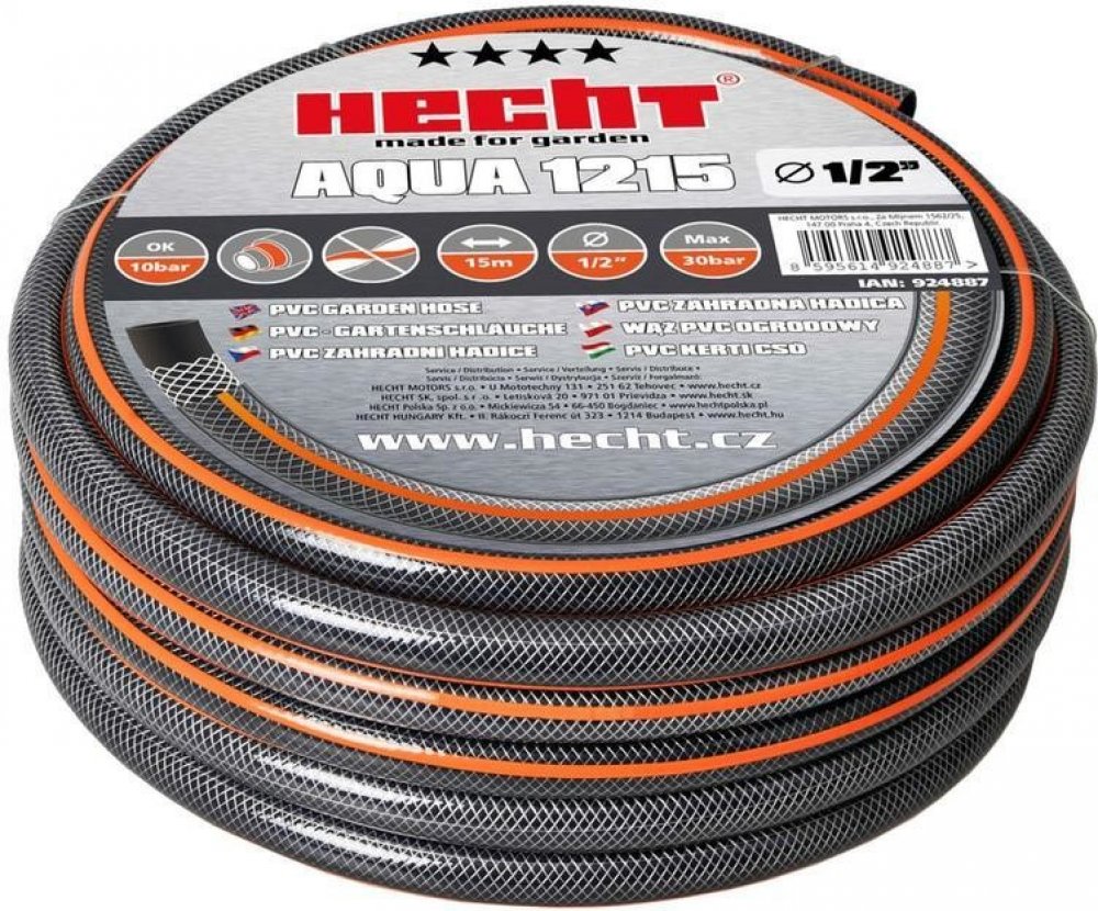HECHT AQUA je odolná třívrstvá PVC hadice vyrobená kombinací měkčeného PVC a tlakovým opletem ze syntetických vláken. Vnitřní černá vrstva zabraňuje tvorbě řas a zajišťuje ochranu proti UV. Střední vrstva ze syntetických vláken dává hadici vysokou tlakovou odolnost. Vnější hladká vrstva dodává vysokou odlnost proti otěru a hadice lépe klouže po terénu. Hadice je tvarově velmi stálá. Maximální tlak je až 30 bar, běžný provozní tlak je 10 bar. Průměr hadice je 1/2". Délka hadice je 15 m.