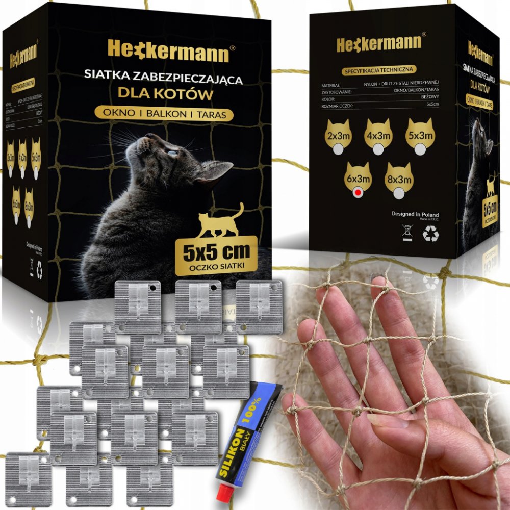 Kompletní sada bezpečnostní sítě pro kočky od společnosti Heckermann, vyztužená kovovým propletením, 6 x 3 m + 80 háčků + lepidlo