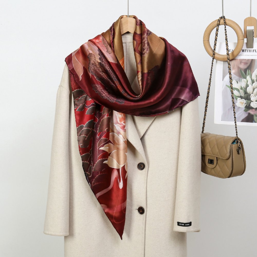 Materiál: 100% morušové hedvábí, provedení satin silk, kvalita obvyklá pro šátky 12 vláken s ručně rolovaným okrajem.