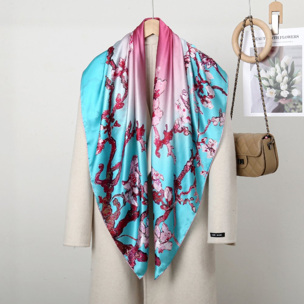 Materiál: 100% morušové hedvábí, provedení satin silk s ručně rolovaným okrajem, kvalita obvyklá pro šátky 12 vláken.