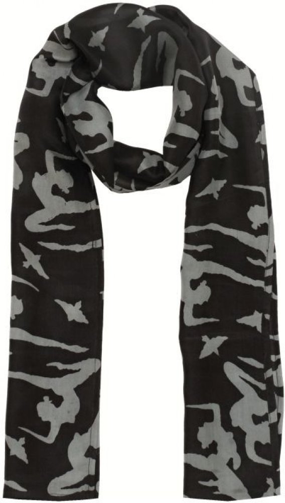 Černý hedvábný šátek se stříbrně šedým jogínským motivem. Dlouhý a lehký šátek z pravého hedvábí (habutai - lehký, lesklý satén) je vzorovaný technikou voskové batiky.