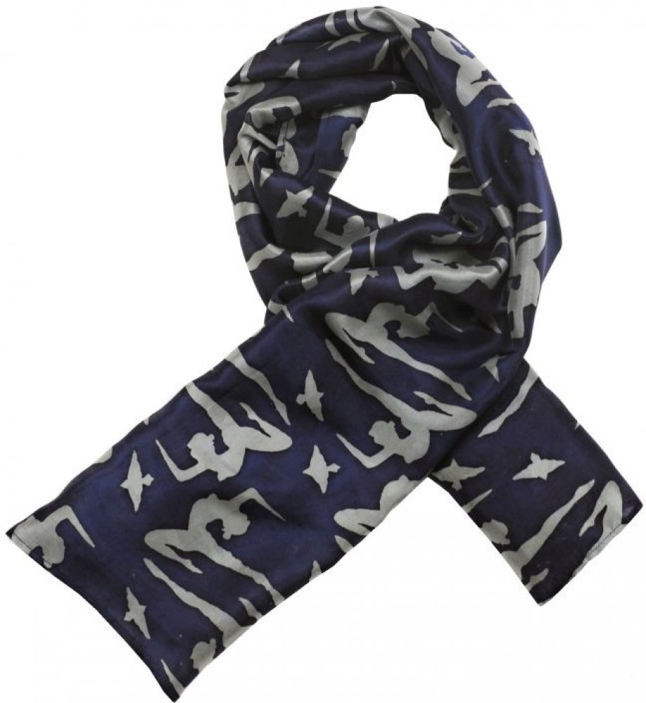 Tmavě modrý hedvábný šátek se stříbrně šedým jogínským motivem. Lehký šátek z pravého hedvábí (habutai - lehký, lesklý satén) je vzorovaný technikou voskové batiky.