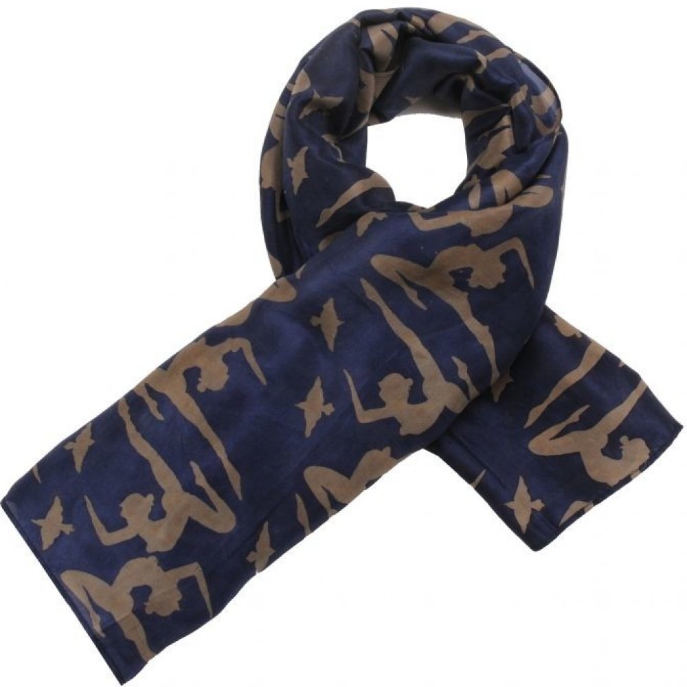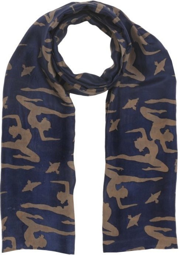 Tmavě modrý hedvábný šátek s matně zlatým jogínským motivem. Lehký šátek z pravého hedvábí (habutai - lehký, lesklý satén) je vzorovaný technikou voskové batiky.