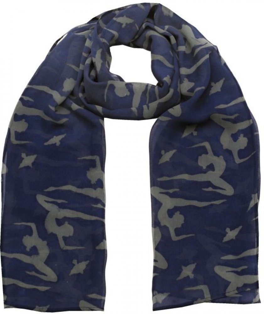 Hedvábný šátek s šedě stříbrným jogínským motivem na tmavě modrém podkladu. Lehký šátek z pravého hedvábí je vzorovaný technikou voskové batiky.