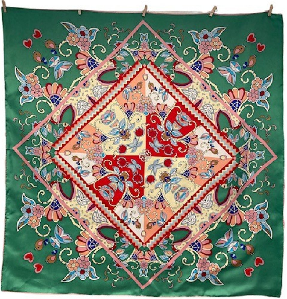 hedvábný šátek zelený s ornamenty v dárkovém balení
