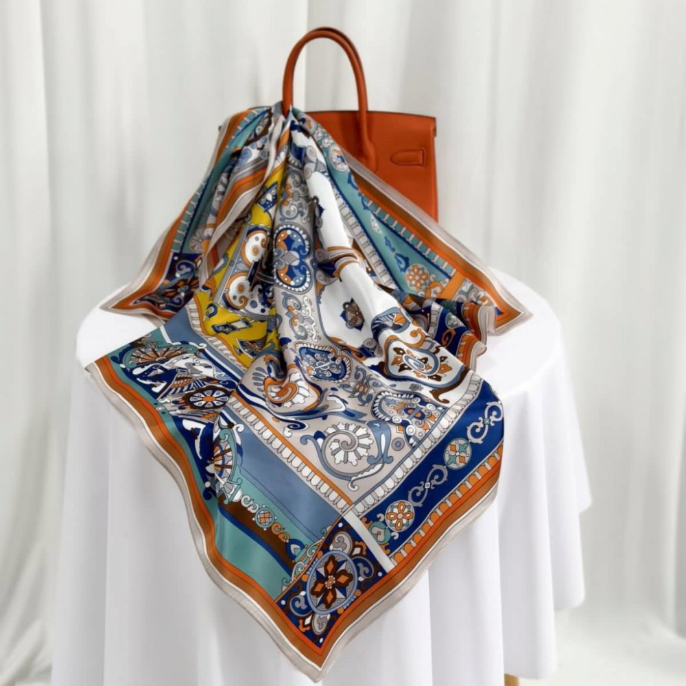 Rozměry hedvábného šátku jsou 90 cm x 90 cm. Šátky jsou vyráběny ručně a tak se rozměr může mírně lišit.