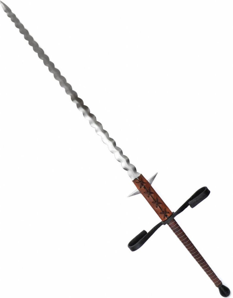 V našem kovářství máme spoustu mečů, ale žádný není jako tento. Při svých rozměrech 168cm, délce ostří 118cm a váze 6kg se jedná o opravdového macka. Během své práce se nechali naši kováři inspirovat tradičními německými meči Flamberge a z oceli 14 260 vytvořili zbraň, která není pouhou dekorací, ale lze ji bez obav použít také k historickému šermu.