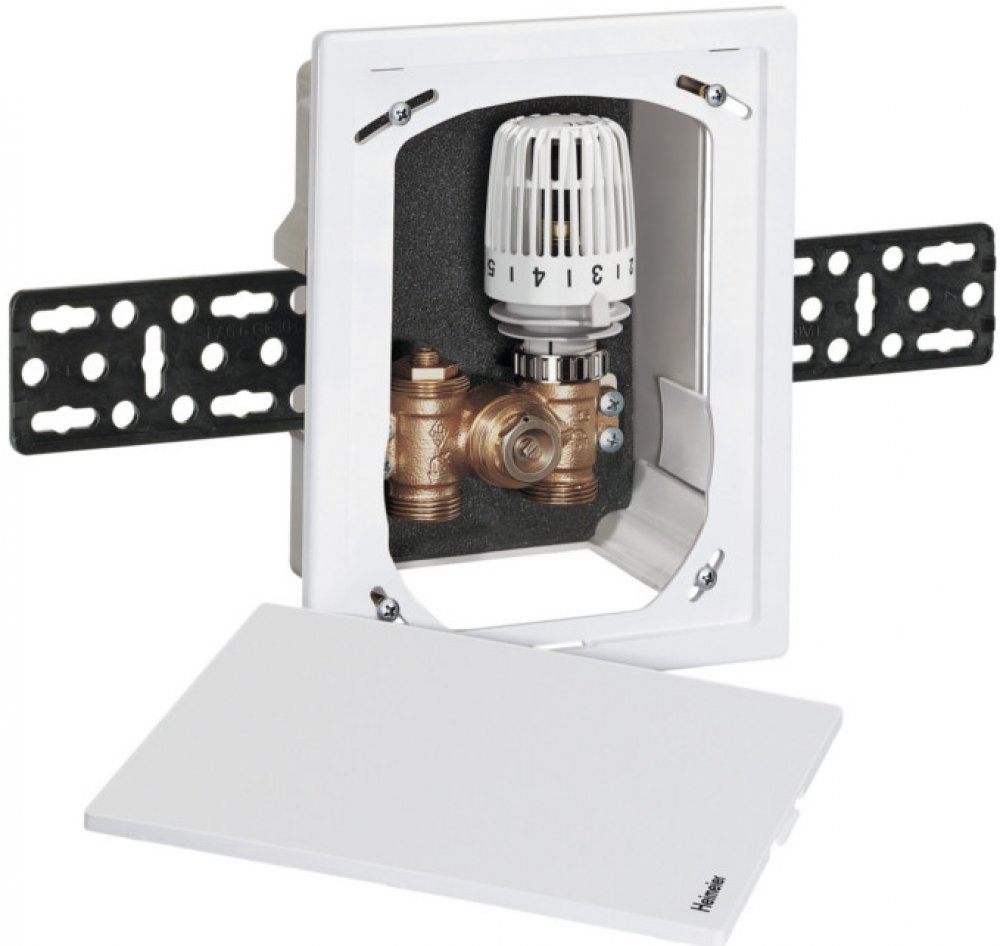 HEIMEIER podomítková montážní sada s vnitřním omezovačem teploty zpětného toku RTL, včetně rámu, uzavřené krycí desky a upevňovacích lišt. Pro omezení zpětné teploty např. kombinovaných podlahových radiátorových topných systémů, těleso ventilu z korozivzdorné červené litiny, včetně odvzdušňovacího ventilu a uzavíracího/regulačního vřetena. Horní část termostatu s nerezovou tyčí a dvojitým O-kroužk...
