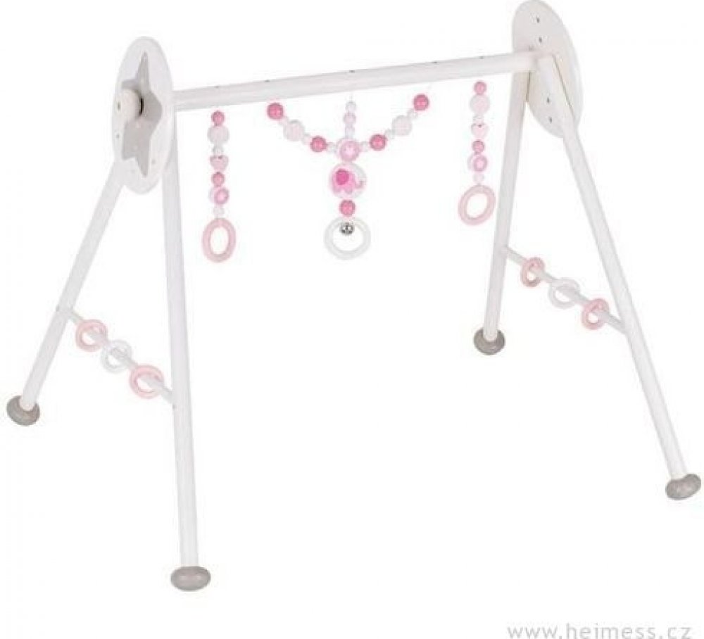 Dřevěná přírodní hrazdička pro malé miminka se slonem a rolničkami. Když dítě sahá po hračkách, rozvíjí si koordinaci zraku a rukou. Hračky na horní rozpěrné tyči nejsou snímatelné. Hrazda je nastavitelná do nastavitelná do 6 poloh, přitom nejvyšší poloha je 53cm. Horní šířka hrazdičky je 55 cm, dolní šířka 63 cm. Výrobek dodáváme nesmontovaný, šroubky jsou součástí výrobku.