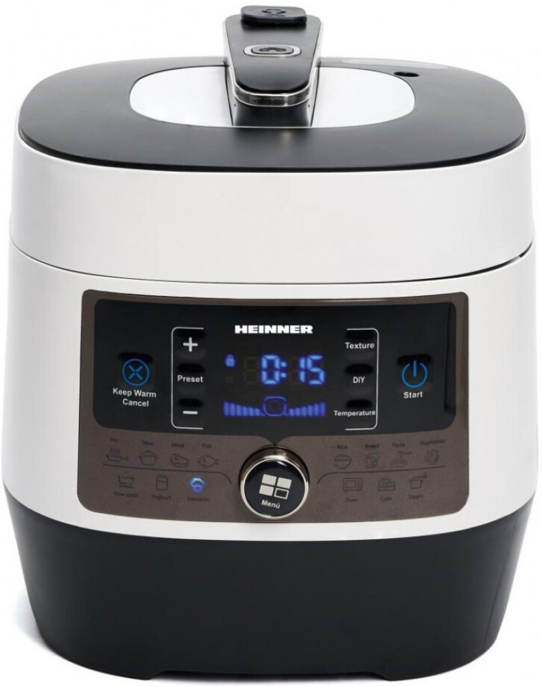 Tlakový hrnec HEINNER HPCK-6WH je multifunkční spotřebič určený pro rychlou, bezpečnou a energeticky úspornou přípravu jídel pod tlakem. Díky příkonu 1000 W umožňuje vaření při maximálním tlaku 0,8 bar, který je nastavitelný ve třech úrovních (nízký, střední, vysoký). Tento model disponuje objemem 4,5 litru, což je ideální kapacita pro přípravu jídel pro rodinu nebo menší skupinu.