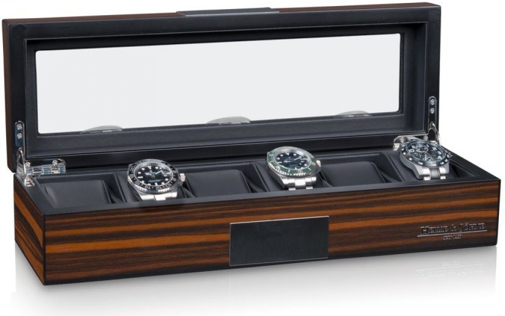 Krabička na hodinky Vegas 6 od Heisse & Söhne Krabička na hodinky Vegas 6 od renomované značky Heisse & Söhne je perfektní úložný box pro vaši sbírku hodinek. Vyrobeno z nejlepších materiálů a promyšleného designu, nabízí stylové a ochranné místo pro vaše cenné hodinky. Kvalita a materiál Tato vysoce kvalitní krabička na hodinky zaujme kombinací minerálního skla a dýhy z ebenového dřeva ve vnější konstrukci. Sklo nejen nabízí ochranu, ale díky velkému průzoru ve víku je také vrcholem prezentace. Černá vnitřní podšívka z imitace kůže podtrhuje eleganci této krabičky a poskytuje dodatečnou ochranu vašim hodinkám. Eloxované designové prvky s broušeným povrchem podtrhují hodnotu krabičky hodinek. Interiér a úložný prostor Díky prostoru až pro 6 hodinek na jedné úrovni nabízí box na hodinky Vegas 6 optimální řešení pro uložení vašich hodinek. Hodinky se drží pomocí polštářku, kde každý polštářek hodinek má obvod 18-19cm. To zajišťuje bezpečné a přitom šetrné uložení vašich hodinek na měkkých polštářcích. Rozsah dodávky Tato položka zahrnuje krabičku hodinek Vegas 6 od Heisse & Söhne. To znamená, že máte vše, co potřebujete k stylovému a bezpečnému uložení hodinek. Box na hodinky Vegas 6 od Heisse & Söhne je víc než jen úložný box. Je to výkladní skříň vašich hodinek, ve které je lze optimálně prezentovat a bezpečně uložit.