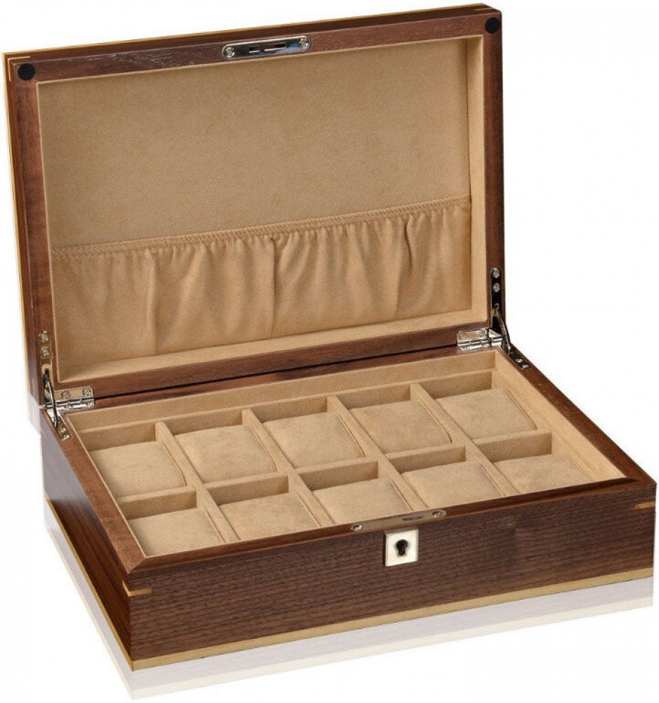 Kazeta na hodinky Heisse & Söhne Abardeen je vyrobena z kvalitního dřeva, přičemž poskytuje prostor pro 10 kusů hodinek. Jednotlivé přihrádky jsou vystlány vrstvou z měkkého semiše, který ochrání hodinky pro mechanickým poškozením. Kazeta se dá uzamknout.Rozměr: 30,5 x 9,5 x 21cm