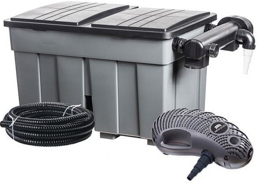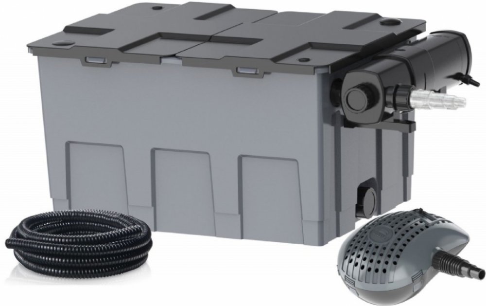 Sada obsahuje: výkonné regulovatelné filtrační čerpadlo (přepravuje nečistoty až do průměru 6 mm), UV lampou proti tvorbě řas (24 W), 5 m připojovací hadicí (25 mm), a filtrační média (filtrační houby různé hrubosti, japonská rohož, domečky pro osídlení bakteriemi).