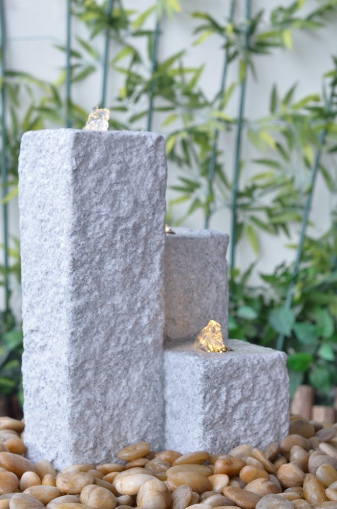 Nádržku zakopejte – do ní umístěte čerpadlo – zakryjte poklopem – nasaďte hadice do určených otvorů kamenných nástavců – naplňte nádržku vodou – zapojte do sítě a hotovo.