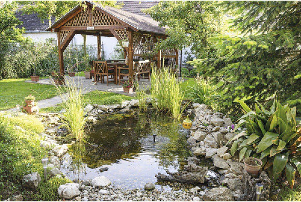 Po vyrovnání fólie můžete zasadit rostliny v sázecích košíkách a usadit techniku. Jezírko naplňte vodou z vodovodu či studny. Po 24 hod. odstřihněte přečnívající fólii. Vytvořený žlábek vyplňte kameny, které upevní folii a zamezí vzlínání vody (kapilárnímu efektu).