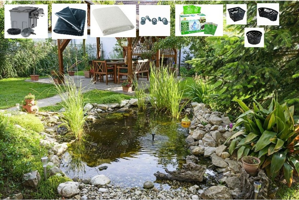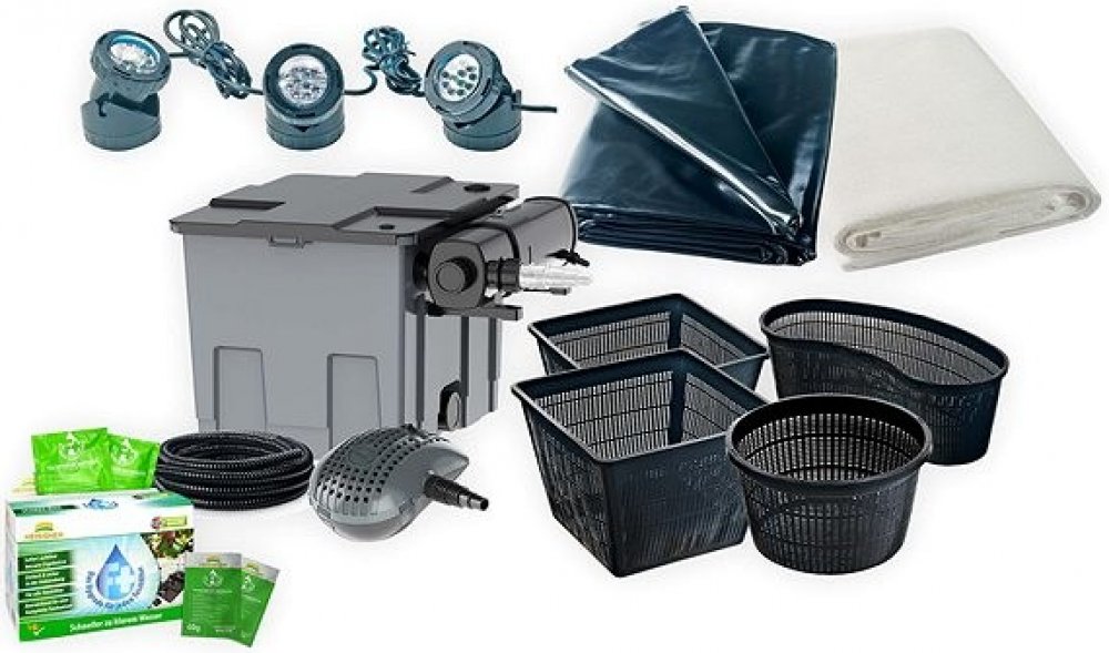 Sada pro výstavbu okrasného jezírka obsahuje jezírkovou fólii, ochranou jezírkovou geotextilii pod fólii, jezírkovou průtokovou filtraci dimenzovanou na chov ryb, včetně filtračních médií, bio domečky pro osídlení jezírkovými bakteriemi, filtrační houby pro hrubé nečistoty, regulovatelné čerpadlo s nízkou spotřebou, UV lampu proti tvorbě řas, hadicové přípojky na propojení čerpadla s filtrací a jezírkovou hadici. Dále roční sadu přípravku, obsahující úpravu vody, která reguluje tvrdost a ph vody, aby správně fungovali jezírkové bakterie odstraňující živiny z vody, druhá složka jsou právě jezírkové bakterie. Obsahuje 10 sáčků což stačí na pokrytí celé sezóny. Jezírkové osvětlení možné použít ve vodě i mimo, včetně výměnných barevných sklíček, pro změnu barvy osvětlení. Sázecí koše na vodní rostliny. Návod s návrhem na vybudování jezírka.