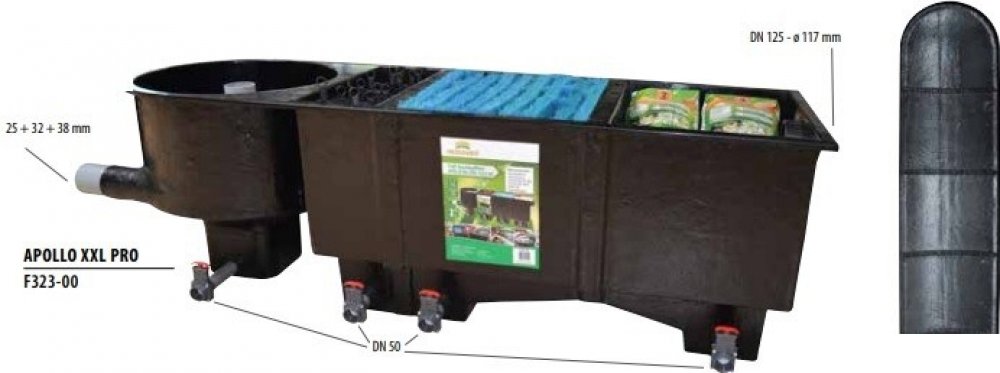 Jezírkový filtrační systém Heissner pro čistou a jasnou vodu ve vašem jezírku. Firma Heissner má více jak 100 let zkušeností s filtračními systémy od tlakových po průtokové a podvodní filtrace. Filtrační systém jednoduše zvolíte dle objemu Vašeho jezírka. Profi průtoková filtrace Heissner F323-00, používá léty osvědčenou konstrukci, velká odstředivka odloučí hrubé i jemné nečistoty. Pak voda pokračuje do dalších komor, které jsou vyspádované a pro snadné čištění má každá svůj vlastní odkalovací ventil. Profi venkovní filtr Apollo může být umístěn vedle jezírka. Je dodáván se všemi filtračními médii a přípojkami. Nejdříve se voda filtruje v první komoře přes odstředivku Vortex, kde se zbaví všech hrubších nečistot před vstupem do biologické části jezírkové filtrace. Nátok vody z jezírka je uprostřed výšky odstředivky a je zaústěn excentricky tak, aby docházelo k rotaci vody. Přepad z odstředivky je v horní části, tak je zaručeno, že nečistoty rotují ve vodě a klesají, dokud se neusadí na dně. Dál voda pokračuje do komory se Sansai kartáči kde dojde k zachycení drobných nečistot. Kartáče jsou vybaveny očky pro snadné vyjmutí. V další části je umístěna filtrační japonská rohož, která slouží jako biologická filtrační plocha pro osídlení filtračních bakterií. V další komoře je speciální filtrační substrát, který se preventivně stará o čistou vodu v zahradním jezírku a podporuje dlouhodobé přirozené čištění vody. Váže škodliviny a přebytečné živiny a bakteriálně je odbourává. K filtraci je dodávány dva přípravky na úpravu vody. Odstraňovač fosfátu 1000 ml, odebere z vody živiny pro řasy. Startovací bakterie k urychlení vzniku biologického samočištění vody .Každá komora filtru je vybavena výpustí pro snadné odkalení. Odkalovací ventily je možné prodloužit za pomocí trubek DN 50 a výpusť do jezírka pomocí DN 125. Tím můžete filtraci umístit dále od jezírka. Parametry Pro jezírka bez ryb do objemu 120 m³ Pro jezírka s rybami do objemu 60 m³ Pro jezírka s koi kapry 30 m³ Doporučené čerpadlo HFP10000-00 10 000 l/h / 95 W Doporučená UV lampa F455X-00 55 W Filtrační média Sansai kartáče, japonská filtrační rohož, filtrační substrát Odstraňovač fosfátu 1000 g Startovací bakterie do jezírka 1000 ml d x š x v 257 x 81 X 80 cm