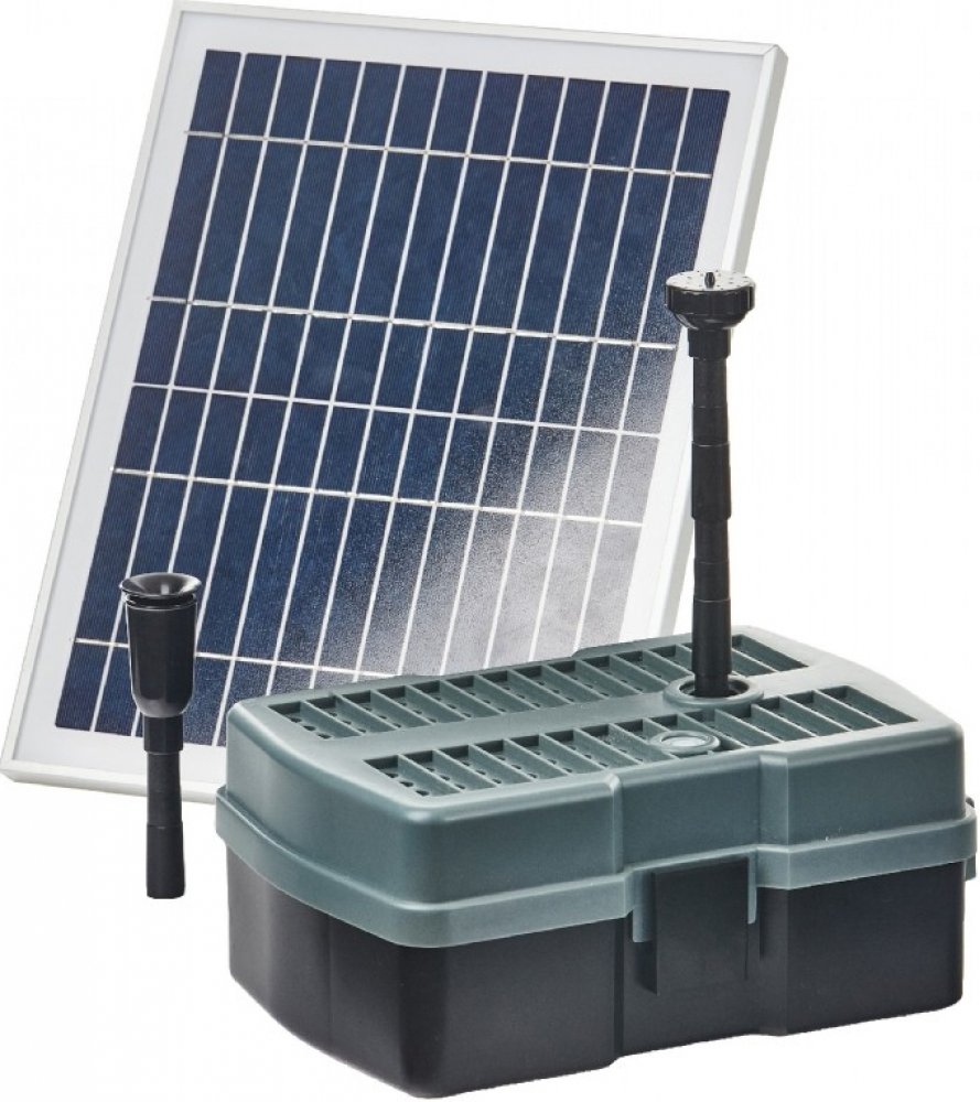 Je určeno pro jezírka do 1000 l. Podvodní filtrace s čerpadlem a integrovanou UV lampou 5 W pro ti řasám. Na těle filtrace je průzor pro kontrolu UV lampy. Celoplošný filtrační povrch s mechanickou filtrací zaručuje prodloužení intervalu mezi nutnou údržbou. Žádná část filtrace prakticky není vidět díky umístění na dně jezírka. Sada čerpadla s filtrem obsahuje teleskopickou trubici a dvě trysky pro vodni efekty. Je osazena filtračními médii, filtračním molitanem pro hrubé nečistoty, bio domečky pro usídlování filtračních bakterií pro biologickou filtraci. Díky solárnímu panelu máte za slunných dní provoz zcela zdarma, ale je i možnost díky dodávanému trafu zapojit filtraci i do elektrické sítě.