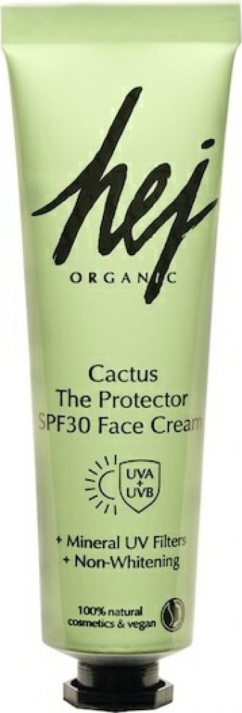 Inovativní krém na obličej Protector SPF30 Cactus vám nabízí dokonalou hydratační péči v kombinaci s každodenní ochranou před slunečním zářením. Pochází od značky Hej Organic, která byla založena v roce 2016 s cílem vyrábět udržitelnou, vysoce kvalitní a přírodní péči o pleť, která je v souladu s přírodou a životním prostředím. Značka sází na účinné látky rostlinného původu, nepoužívá testování na zvířatech a svou kosmetiku vyrábí převážně klimaticky neutrálním způsobem. Veganský krém na ochranu proti slunci a hydratační krém pro každý den Slunce znamená pohodu a život - pokud však dopadá na pokožku nefiltrovaně, může vést k jejímu poškození, onemocnění a předčasnému stárnutí. I za zamračeného počasí jsou škodlivé UV paprsky přítomny a The Protector Face Cream SPF30 Cactus před nimi poskytuje účinnou ochranu. Jako minerální opalovací krém s vysokým ochranným faktorem 30 působí přirozeně a bez chemických látek proti UV záření.Krém z řady Hej Organic dodává pokožce pocit uvolnění, osvěžuje pleť a má příjemnou citrusovou vůni. Snadno se roztírá a rychle se vstřebává, aniž by zanechával lepkavé stopy. Pleťová péče Hej Organic je obohacena o cenné látky, jako je olej ze semen opuncie, vitamin C a kyselina hyaluronová. Ty mají intenzivní hydratační, antioxidační a zpevňující účinek. Těšte se na mladistvě pevnou, zdravě vypadající a chráněnou pleť!