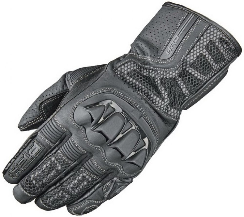 Letní sportovně-cestovní rukavice na motorku z klokaní kůže a prodyšné síťoviny s perforací mezi prsty, na hřbetu i dlani a límci.