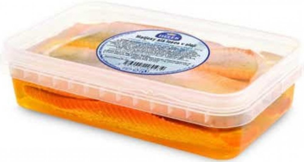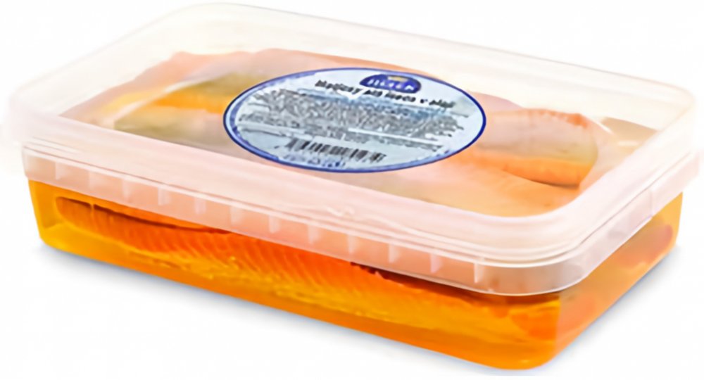 -- Výrobek ze solených sleďových filetů na způsob lososa v oleji.Hmotnost pevného podílu 300 g.