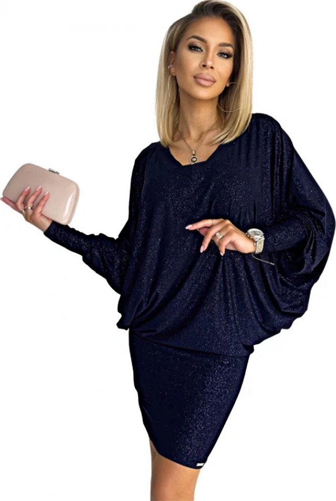 Pohodlí a šmrnc v jednom ✨ Volný netopýří střih a elastický třpytivý materiál dělají z těchto šatů ideální volbu pro každou ženu, která se chce cítit sebevědomě a pohodlně. Elegantní tmavě modrá barva a netradiční rukávy vytváří efekt ležérní elegance. Ideální na večírky, oslavy i sváteční chvíle.