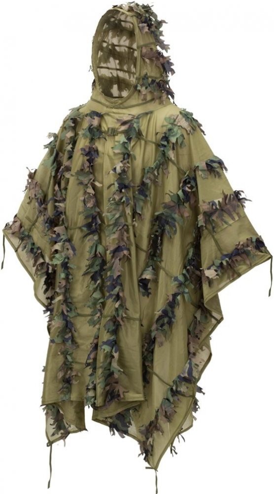Kvalitní maskovací pončo vyrobené z prodyšného polyesteru, který nabízí nízkou hmotnost a vysokou odolnost. Část ponča je pošitá umělým listím v kamufláži US WOODLAND.