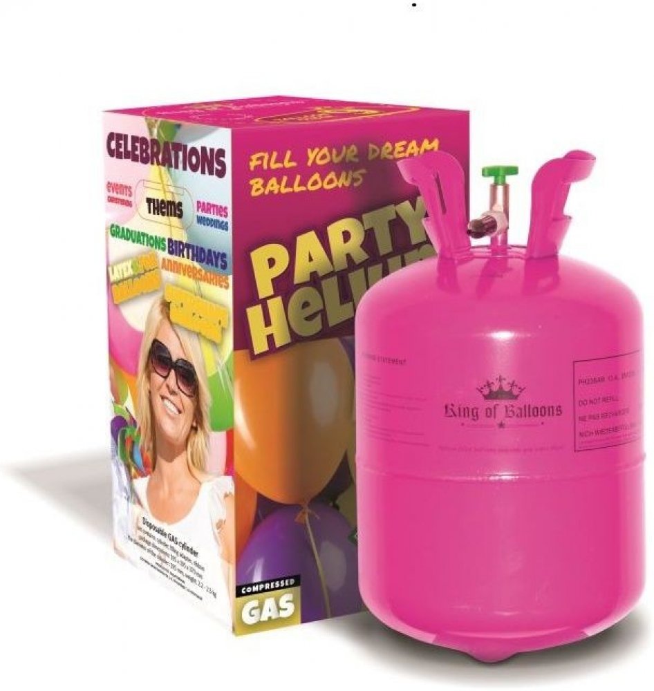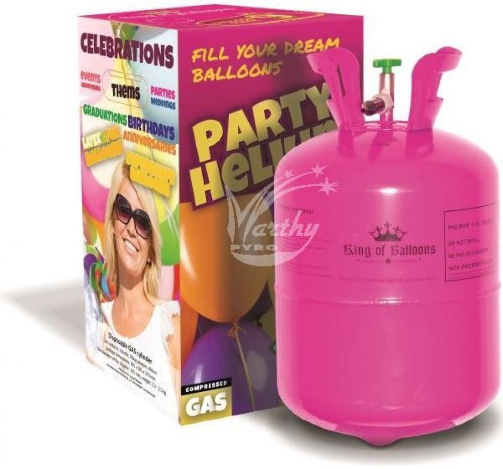 Helium King do 20 balonků je jednorázová tlaková bomba obsahující 140 litrů helia. Pomocí této bomby nafouknete Heliem až 20 latexových balonků o průměru 23 cm.