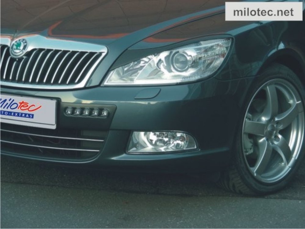 Zástavba LED denních + pozičních světel s krycím rámečkem je určena pro vozy Škoda Octavia II. Lim./Combi. Facelift. Krycí plasty jsou vyrobeny z černého ABS/ASA - tento materiál je UV stabilní.