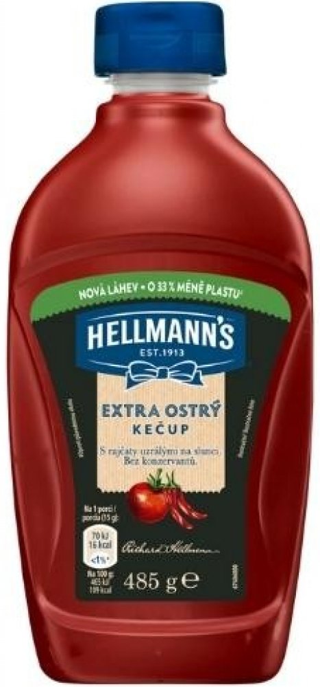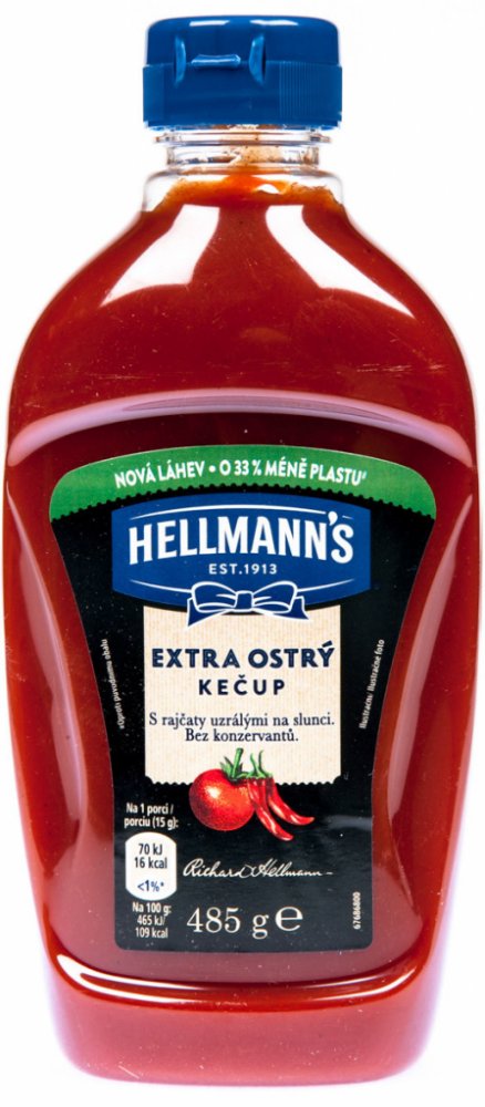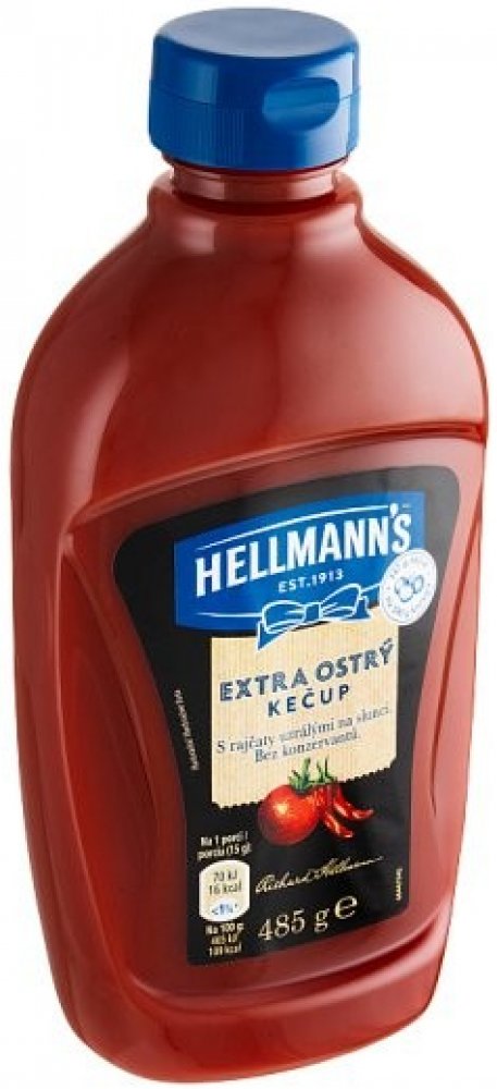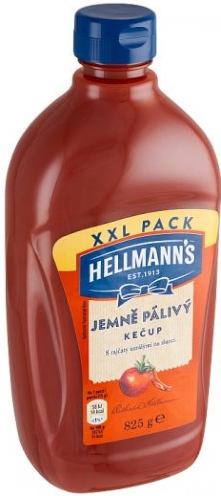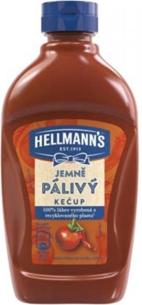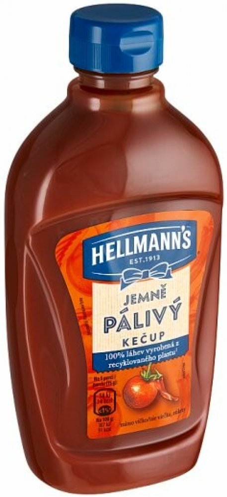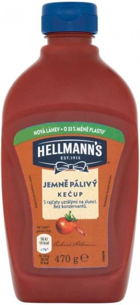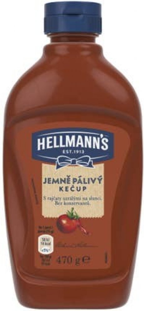 Hellmann's jemně pálivý kečup v nové atraktivní průhledné láhvi. Kečup má bohatou kečupovou chuť, protože je s rajčaty, která uzrála na slunci. Jistě oceníte, že receptura neobsahuje konzervační látky.
