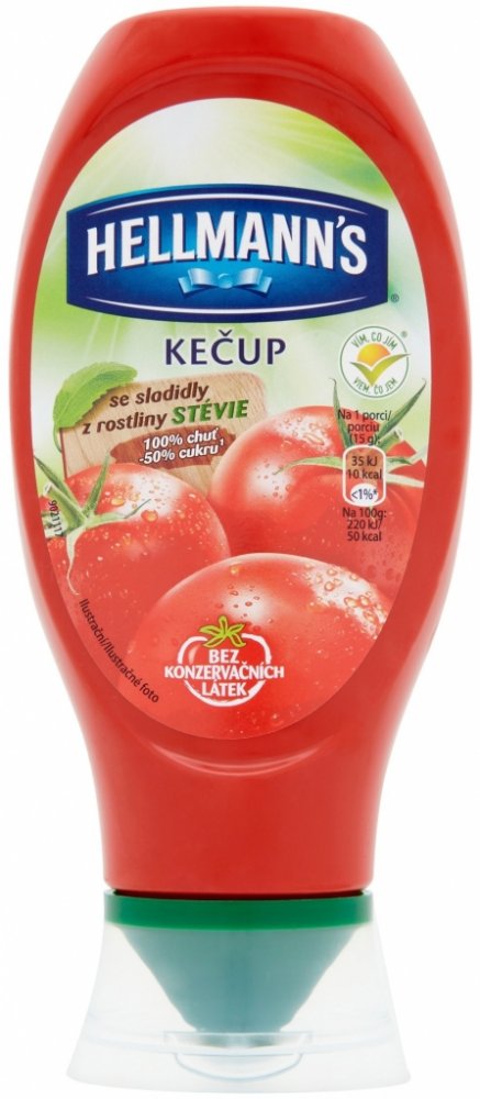 Kečup jemný s cukrem a sladidly steviol-glykosidy z rostliny stévie, se sníženým obsahem cukru.- bez konzervačních látek- o 50% méně cukru- atraktivní baleníVyzkoušejte oblíbený kečup s bohatou kečupovou chutí, s obsahem rajčat, která uzrála na slunci, v atraktivní plastové láhvi s recepturou bez konzervačních látek a s o 50% méně cukru. Nyní si dochutíte svůj párek v rohlíku, tousty, pečené brambory, grilované maso nebo omáčku jednoduše a bez výčitek., Hellmann's prostě to nejlepší!, Unilever, holandsko-britská společnost založena v roce 1930, je dnes jedním z největších výrobců a dodavatelů spotřebního zboží na světě. Unilever nabízí ve více než 190 zemích více než 400 značek potravin, výrobků pro péči o domácnost a výrobků pro osobní péči. Unilever každý den pracuje na vytvoření lepší budoucnosti. Pomáhá lidem cítit se dobře, vypadat dobře a získávat více ze života se svými značkami jako například Flora, Magnum, Dove, Axe, Rexona, Cif či Domestos. Unilever je zavázán k zodpovědnému chování a věří, že s pomocí 2 miliard svých zákazníků dokáže měnit svět k lepšímu.Více informací na www.unilever.cz, Více informací na www.vimcojim.cz, Rajčatový protlak zahuštěný,
