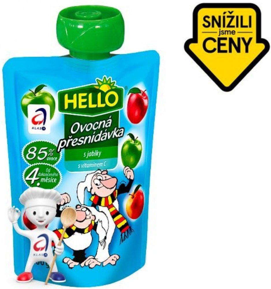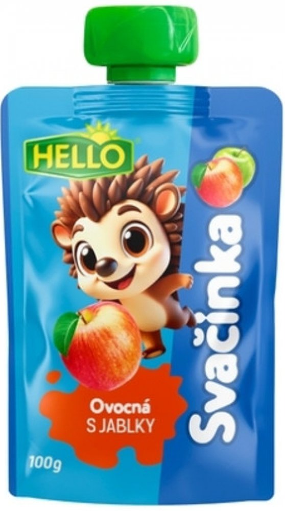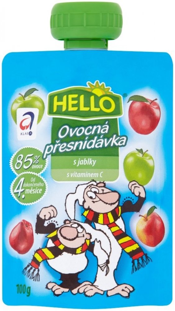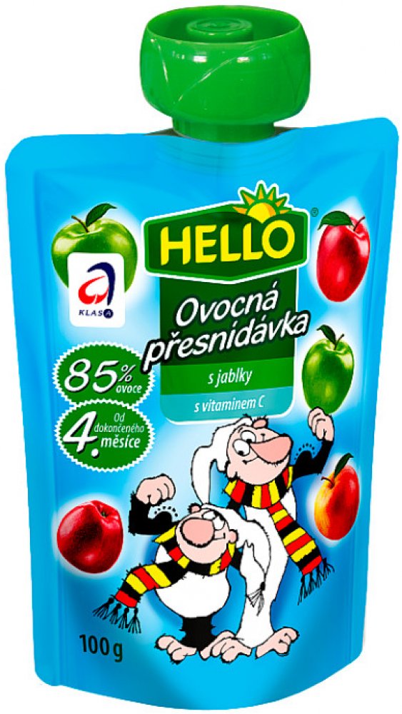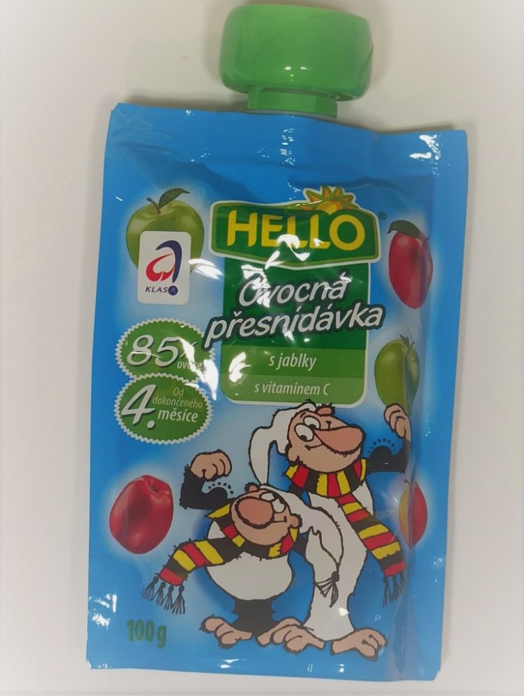 HELLO Ovocná přesnídávka - kapsička s jablky obsahuje stejně dobrou přesnídávku jako dětské přesnídávky HELLO ve skleničkách, navíc přináší zcela nový způsob používání. Stávající způsob podávání vyhovuje spoustě maminek a tatínků. Ale přesto, když chtějí vzít dítěti jídlo s sebou na výlet nebo jen na procházku, mají obavy, že se sklenice rozbije nebo se dítě ušpiní. Nové kapsičky plné ovocné přesnídávky může dítě samo "vysát" bez nutnosti použít lžičku. Tím tento způsob konzumace otevírá dveře novému používání. Kapsičku můžete hodit do školní brašny na svačinu, nabalit na výlet či hřiště. Nebo ji vzít do auta a po cestě vaše dítě zdravě posvačí a vnitřek auta zůstane čistý, na rozdíl od svačiny ze skleničky. 100g.