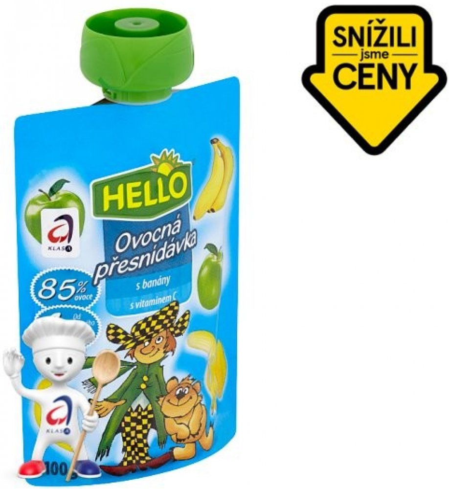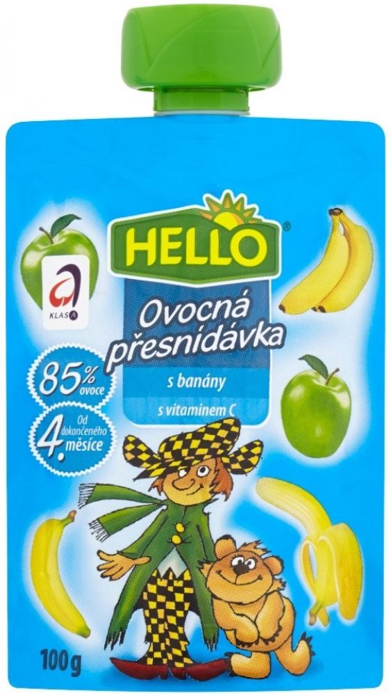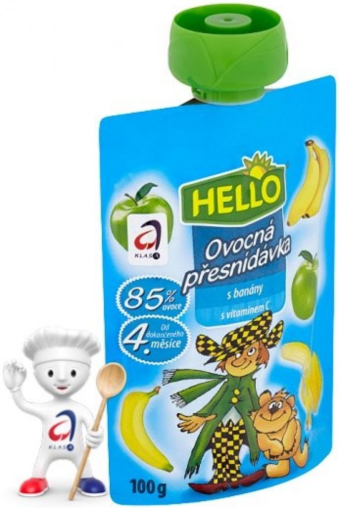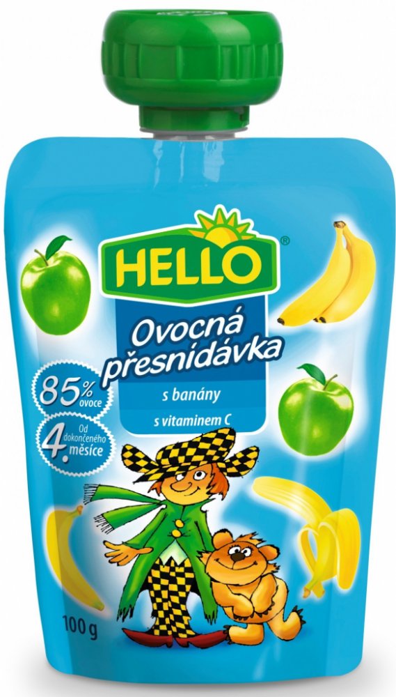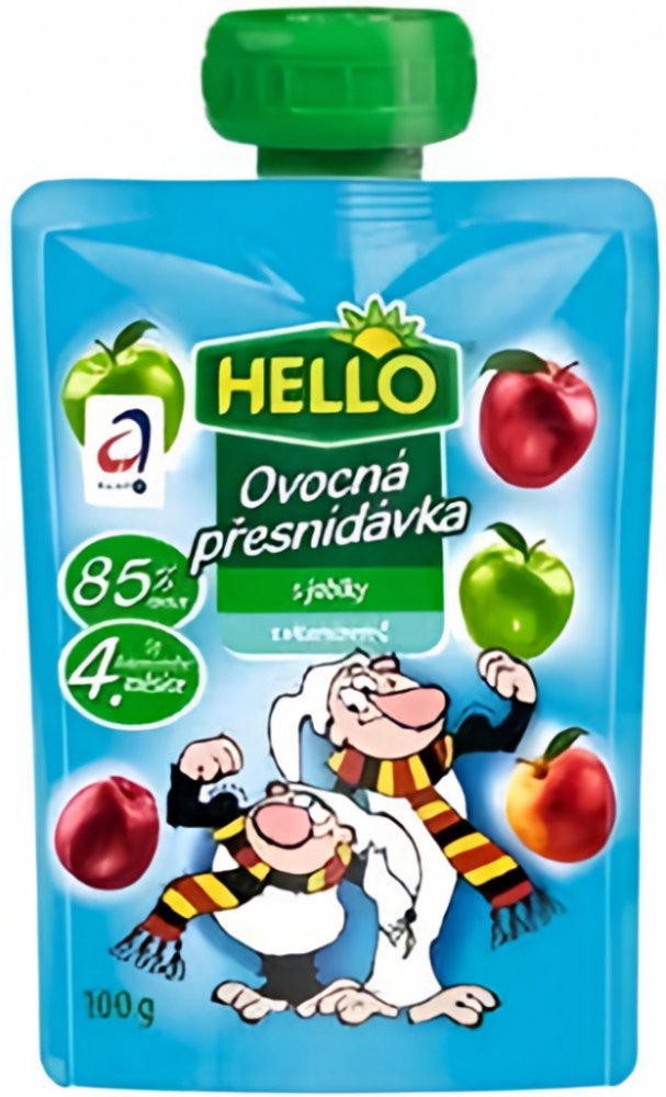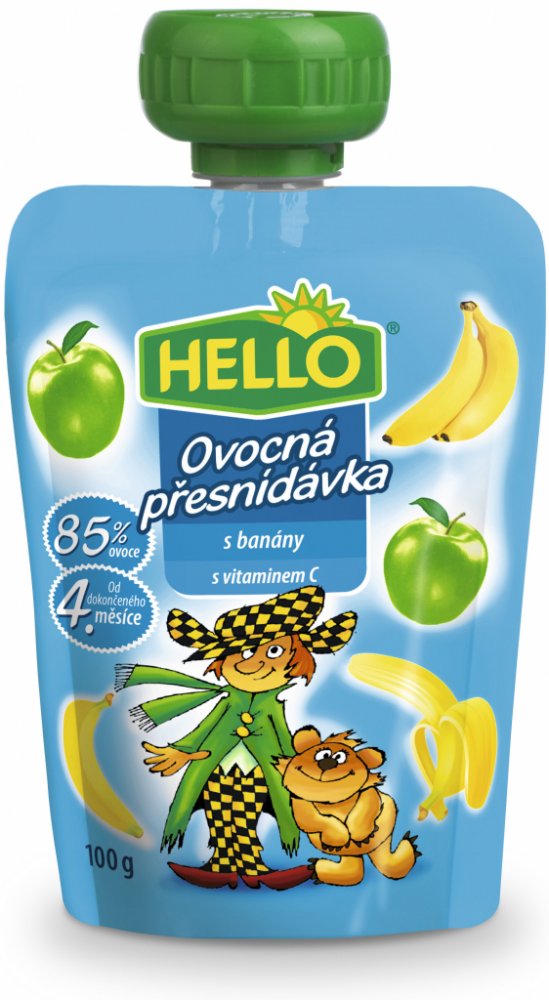 HELLO Ovocná přesnídávka - kapsička s jablky obsahuje stejně dobrou přesnídávku jako dětské přesnídávky HELLO ve skleničkách, navíc přináší zcela nový způsob používání. Stávající způsob podávání vyhovuje spoustě maminek a tatínků. Ale přesto, když chtějí vzít dítěti jídlo s sebou na výlet nebo jen na procházku, mají obavy, že se sklenice rozbije nebo se dítě ušpiní. Nové kapsičky plné ovocné přesnídávky může dítě samo "vysát" bez nutnosti použít lžičku. Tím tento způsob konzumace otevírá dveře novému používání. Kapsičku můžete hodit do školní brašny na svačinu, nabalit na výlet či hřiště. Nebo ji vzít do auta a po cestě vaše dítě zdravě posvačí a vnitřek auta zůstane čistý, na rozdíl od svačiny ze skleničky. 100g.