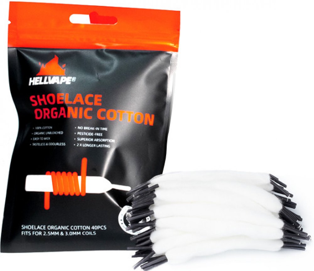 Hellvape Shoelace Organic Cotton přináší praktický způsob osazování vaty pro RTA a RDA atomizéry. Jejich vata je 100% přírodní, nebělená a nebyly na ni použité žádné pesticidy.
