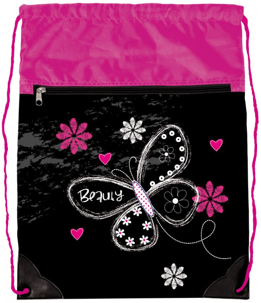 Školní sáček na cvičky vhodný pro žáky 1. stupně ZŠ je vyroben z kvalitního materiálu s motivem motýlka.  Má jednu hlavní kapsu na stažení šňůrkami a jednu menší kapsu na zip. Vak děti využijí na přezůvky, tělocvik, pomůcky na zájmový kroužek.