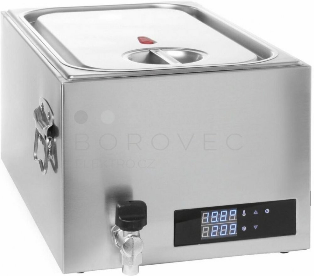 Teplota se termostatem dá jednoduše nastavit tlačítkem na displeji od 45-90 °C. Vařič Sous-Vide je naprosto vhodný pro přípravu pokrmů mimo špičku. Pohon je zajišťován napájením o 230 V a příkonem 0,6 kW. Robustní vařič je vyroben z celonerezové oceli s perforovanou vložkou s oddělovači a víkem se silikonovým těsněním s kapacitou GN 1/1. Systém je vybaven úchyty a také vypouštěcím kohoutem pro snadné vylévání vody. Jedná se o digitální ovládání displeje (indikace teplot, časovače, symbol teploty, symbol časovače, symbol nahoru, symbol dolu, symbol zap./vyp.). Tento přístroj je vybaven ochranou proti přehřátí. Obsah vařiče je 20 litrů. Určeno pro střední a malé gastronomické provozy.